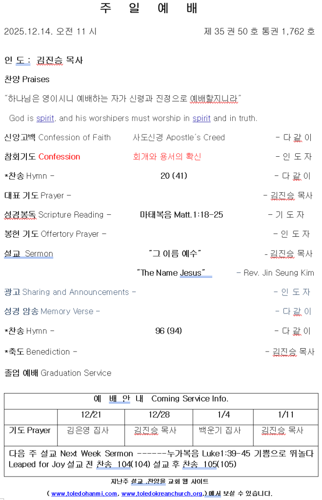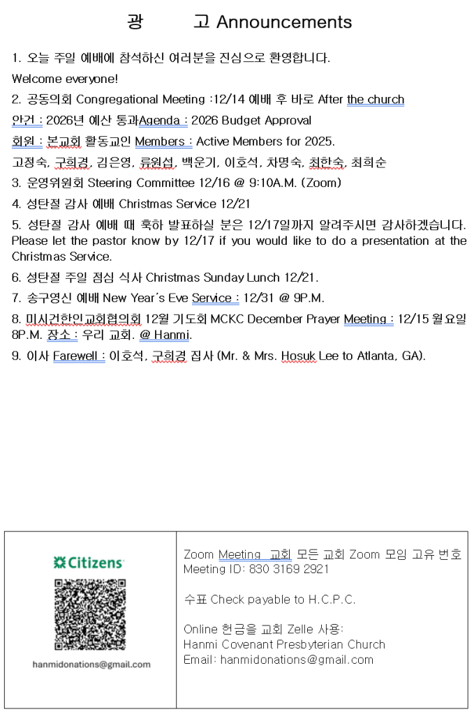 12/14/2025 주보 admin December 12, 2025 주보 0 Comments Tagged 12/14/2025 주보 Post navigation Previous Previous post: 한미언약장로교회 찬양팀 12/7/2025 – 하루의 은혜 Leave a Reply Cancel replyYour email address will not be published. Required fields are marked *Comment * Name * Email * Website Save my name, email, and website in this browser for the next time I comment.