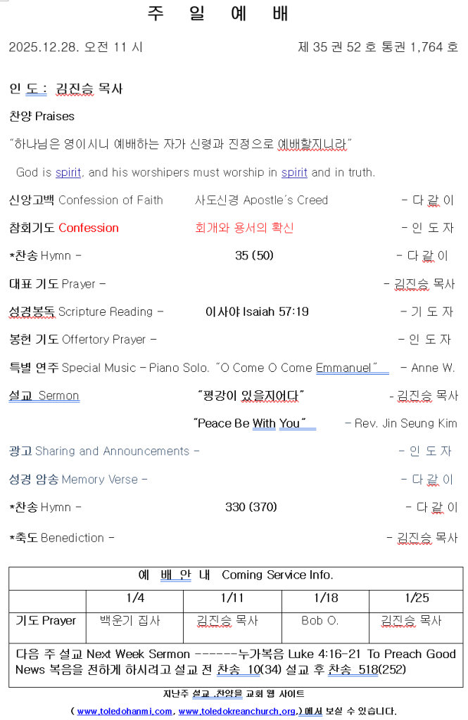 12/28/2025 주보 admin December 27, 2025 주보 0 Comments Tagged 12/28/2025 주보 Post navigation Previous Previous post: 기쁨으로 뛰놀다 누가복음 Luke 1:39-45 12/21/2025 톨리도 한미언약장로교회 김진승 목사Next Next post: 평강이 있을지어다 아사야 Isaiah 57:19 12/28/2025 톨리도 한미언약장로교회 김진승 목사 Leave a Reply Cancel replyYour email address will not be published. Required fields are marked *Comment * Name * Email * Website Save my name, email, and website in this browser for the next time I comment.