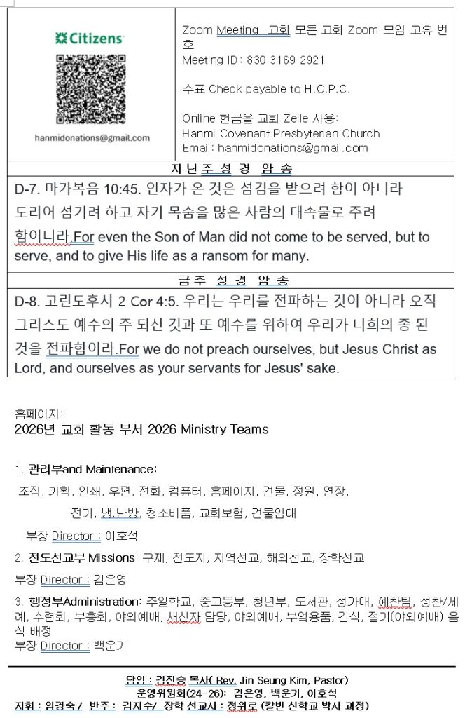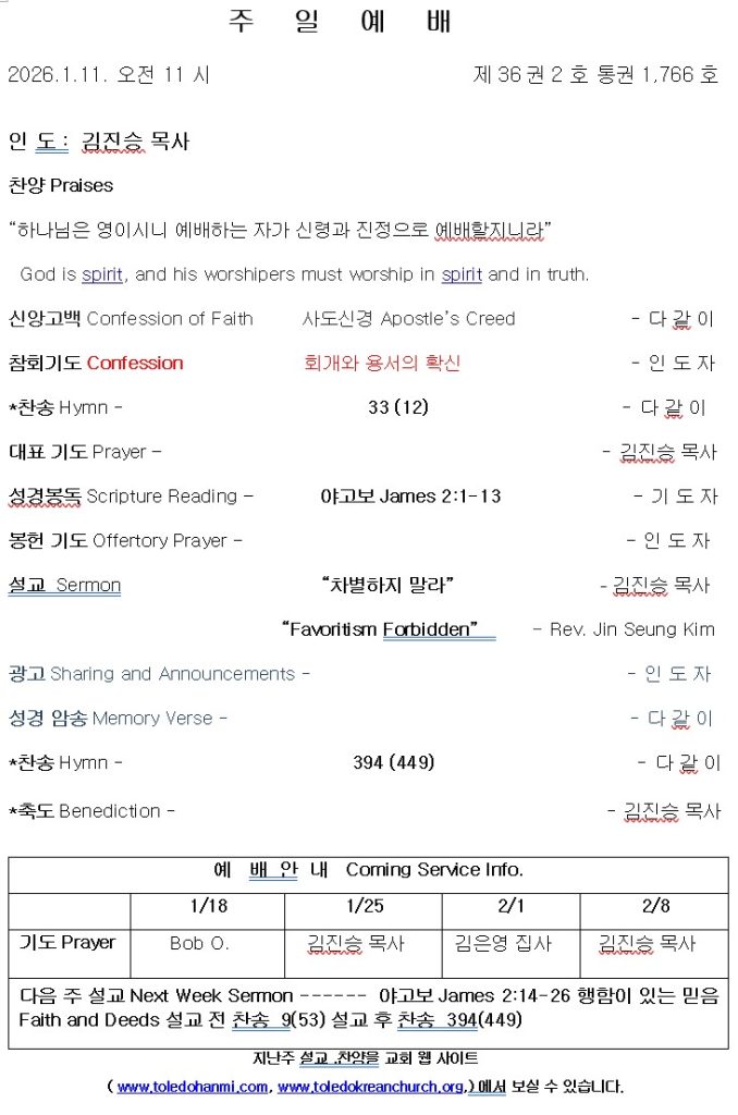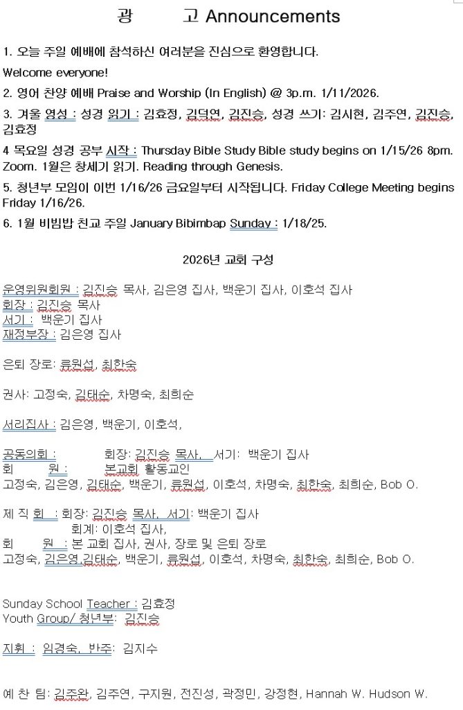 1/11/2026 주보 admin January 10, 2026 주보 0 Comments Tagged 1/11/2026 주보 Post navigation Previous Previous post: New Year’s Day Dinner 2026Next Next post: Praise and Worship 1/11/26 (1) Leave a Reply Cancel replyYour email address will not be published. Required fields are marked *Comment * Name * Email * Website Save my name, email, and website in this browser for the next time I comment.