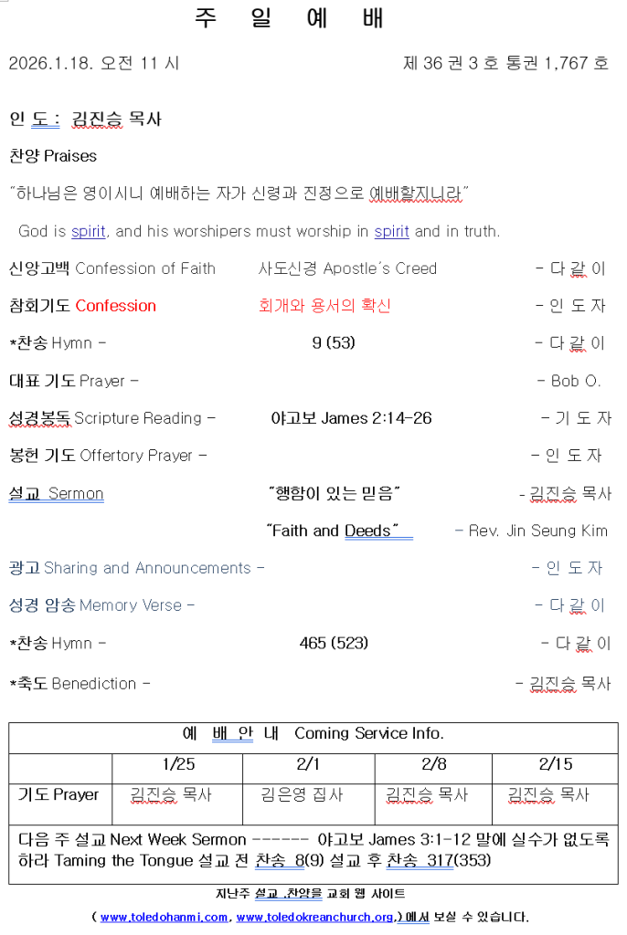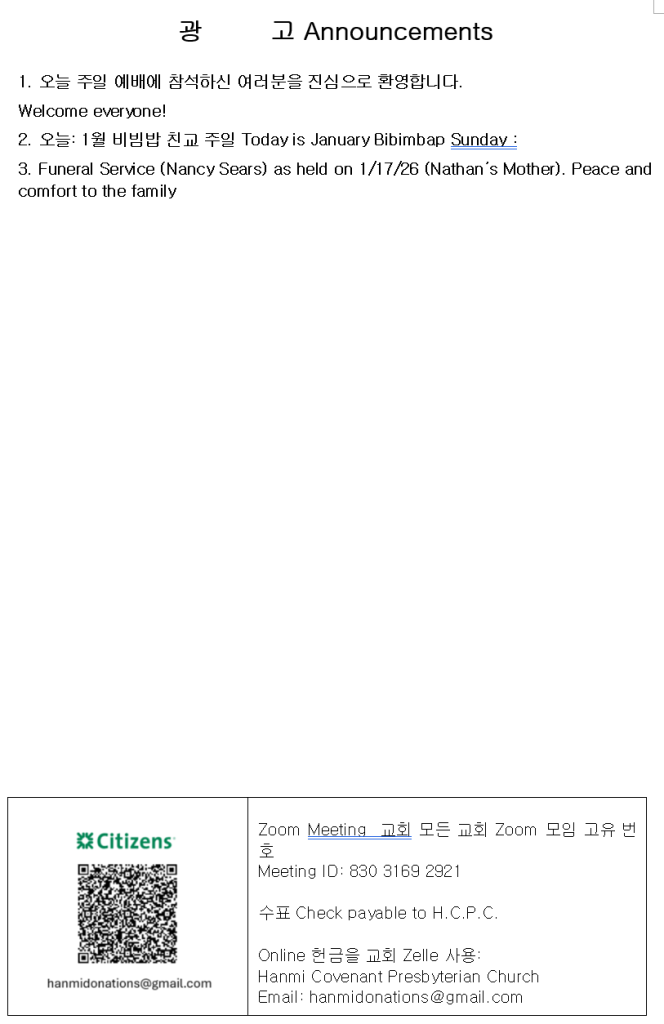 1/18/2026 주보 admin January 16, 2026 주보 0 Comments Tagged 1/18/2026 주보 Post navigation Previous Previous post: 1/10/26 오늘의 양식Next Next post: 한미언약장로교회 찬양팀 1/18/2026 Leave a Reply Cancel replyYour email address will not be published. Required fields are marked *Comment * Name * Email * Website Save my name, email, and website in this browser for the next time I comment.