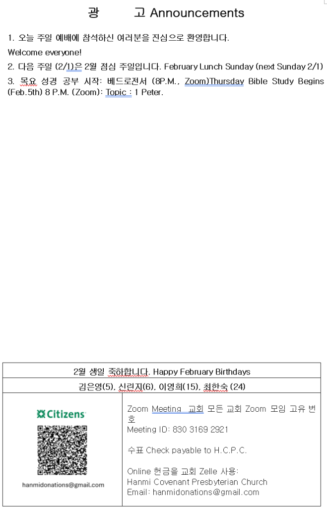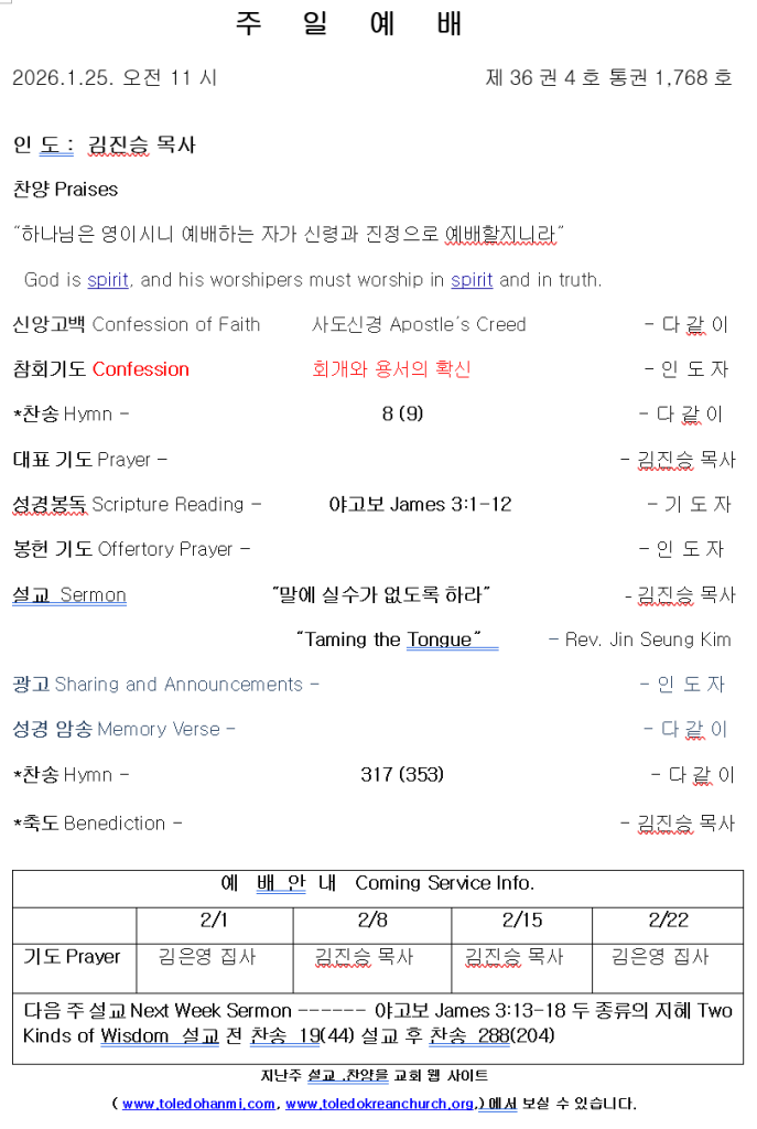 1/25/2026 주보 admin January 23, 2026 주보 0 Comments Tagged 1/25/2026 주보 Post navigation Previous Previous post: 행함이 있는 믿음 야고보 Jsmes 2:14-26 01/18/2025 톨리도 한미언약장로교회 김진승 목사Next Next post: 오늘의 양식 1/24/26 Leave a Reply Cancel replyYour email address will not be published. Required fields are marked *Comment * Name * Email * Website Save my name, email, and website in this browser for the next time I comment.