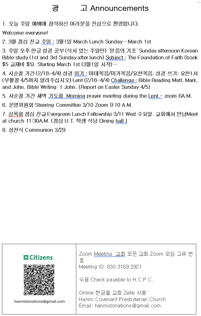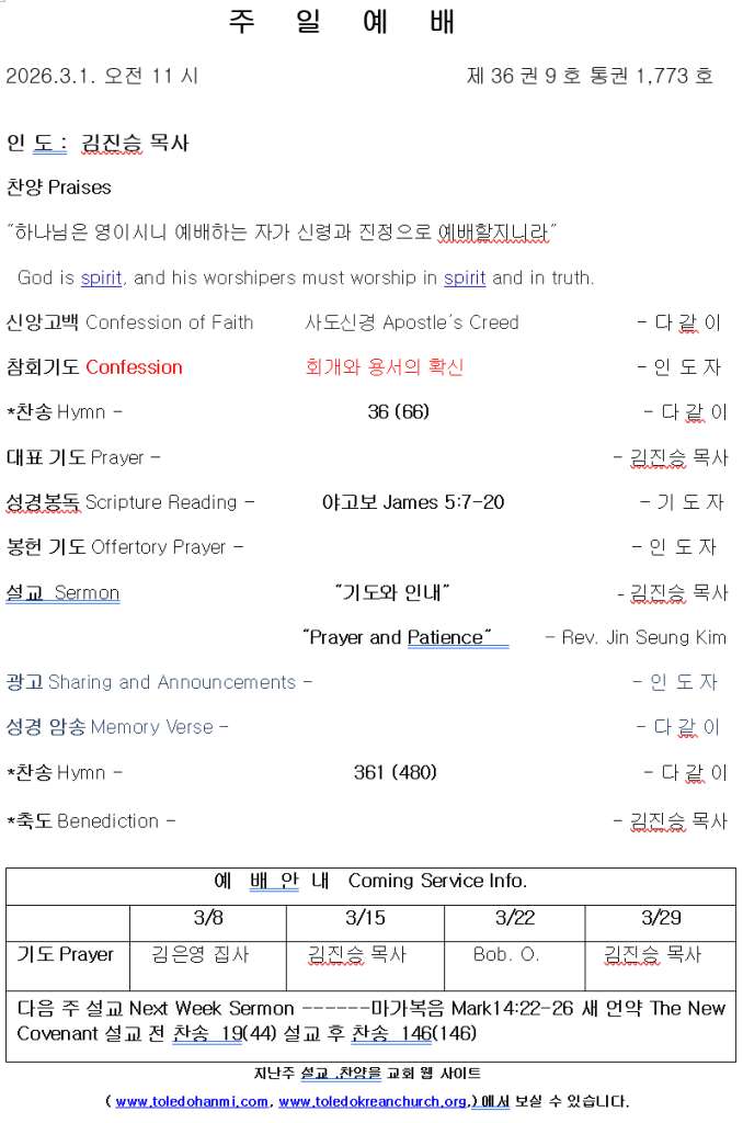 3/1/2026 주보 admin February 27, 2026 주보 0 Comments Tagged 3/1/2026 주보 Post navigation Previous Previous post: 한미언약장로교회 찬양팀 2/22/2026 Leave a Reply Cancel replyYour email address will not be published. Required fields are marked *Comment * Name * Email * Website Save my name, email, and website in this browser for the next time I comment.