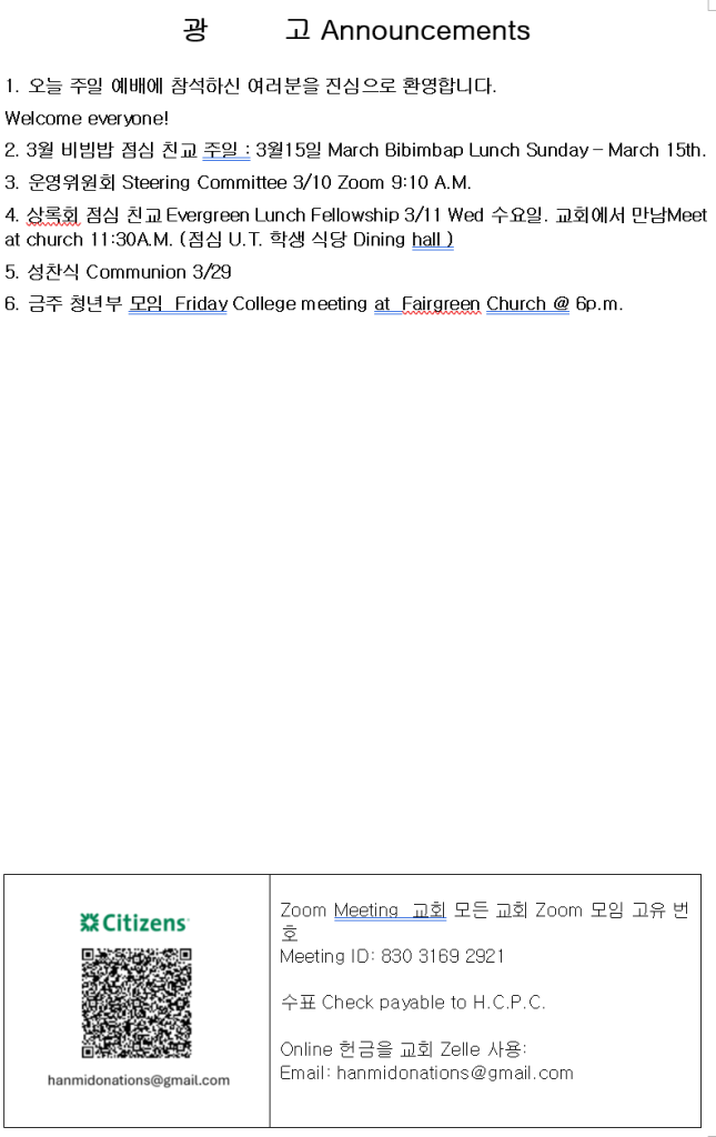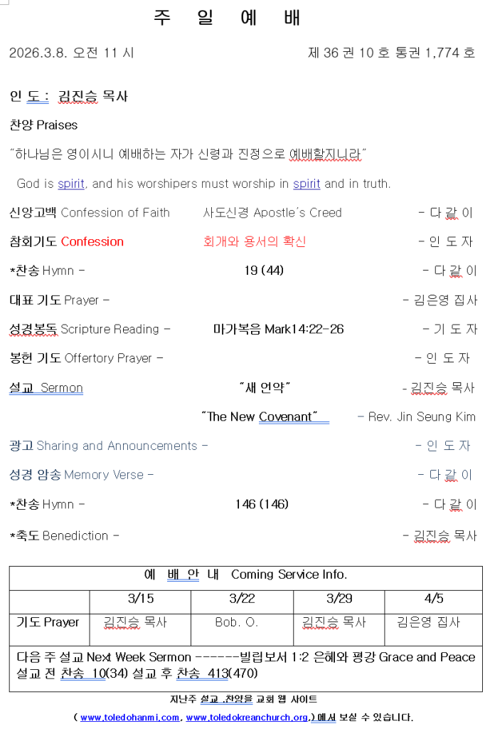 3/8/2026 주보 admin March 6, 2026 주보 0 Comments Tagged 3/8/2026 주보 Post navigation Previous Previous post: 오늘의 양식 2/28/26Next Next post: 새 언약 마가복음 Mark14:22-26 03/08/2026 톨리도 한미언약장로교회 김진승 목사 Leave a Reply Cancel replyYour email address will not be published. Required fields are marked *Comment * Name * Email * Website Save my name, email, and website in this browser for the next time I comment.