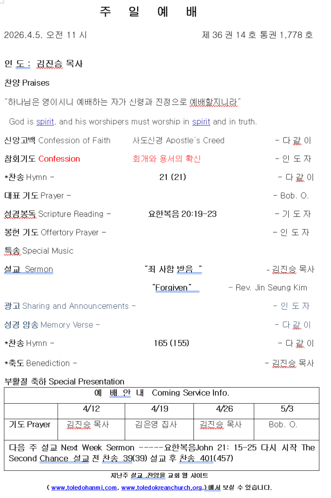 4/5/2026 주보 admin April 4, 2026 주보 0 Comments Tagged 4/5/2026 주보 Post navigation Previous Previous post: 특송 – 윤나경(Bridget), 김지수 3/29/2026 Leave a Reply Cancel replyYour email address will not be published. Required fields are marked *Comment * Name * Email * Website Save my name, email, and website in this browser for the next time I comment.