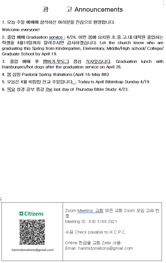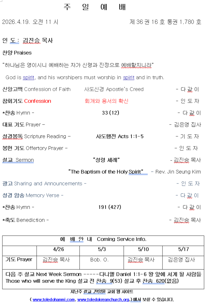 4/19/2026 주보 admin April 17, 2026 주보 0 Comments Tagged 4/19/2026 주보 Post navigation Previous Previous post: 오늘의 양식 4/11/26Next Next post: 한미언약장로교회 찬양팀 04/19/2026 Leave a Reply Cancel replyYour email address will not be published. Required fields are marked *Comment * Name * Email * Website Save my name, email, and website in this browser for the next time I comment.