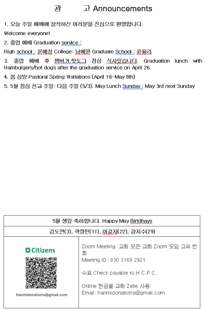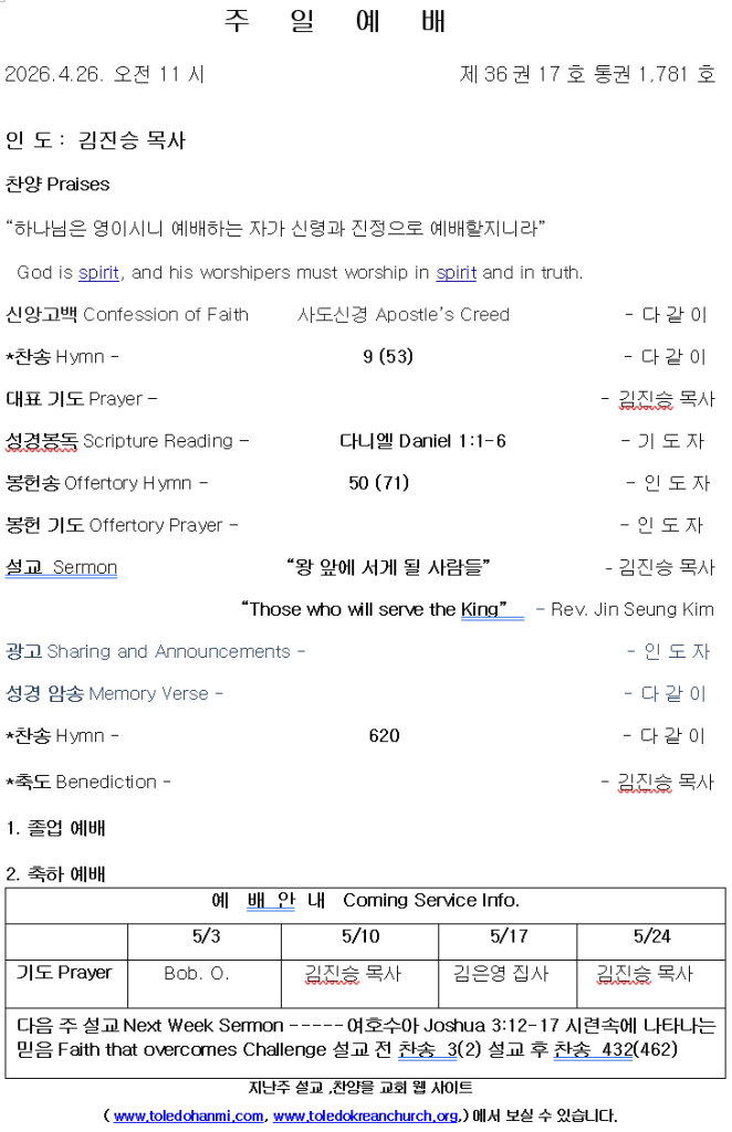 4/26/2026 주보 admin April 24, 2026 주보 0 Comments Tagged 4/26/2026 주보 Post navigation Previous Previous post: 성령세례 사도행전 Acts 1:1-5 04/19/2026 톨리도 한미언약장로교회 김진승 목사 Leave a Reply Cancel replyYour email address will not be published. Required fields are marked *Comment * Name * Email * Website Save my name, email, and website in this browser for the next time I comment.